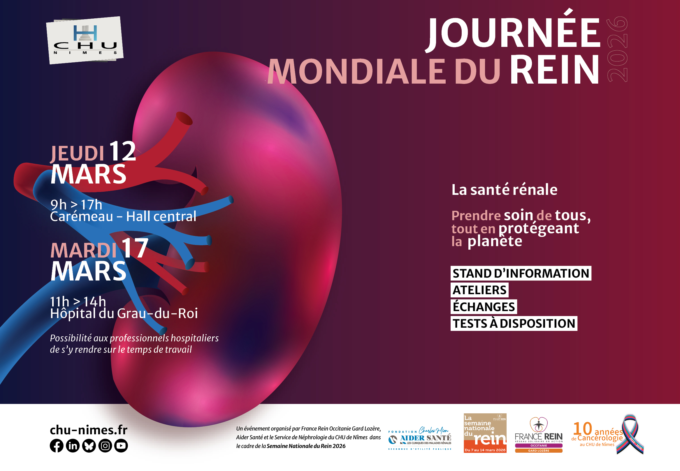 le partenariat avec le CHU de Nîmes, et en particulier son service de Néphrologie-Dialyse-Aphérèse, constitue un pilier essentiel des actions de prévention menées sur le territoire. La Journée mondiale du Rein est une occasion privilégiée pour faire le point sur sa santé rénale. Jeudi 12 mars, dans le hall central de l’hôpital universitaire Carémeau, chacun est invité à venir se faire dépister.