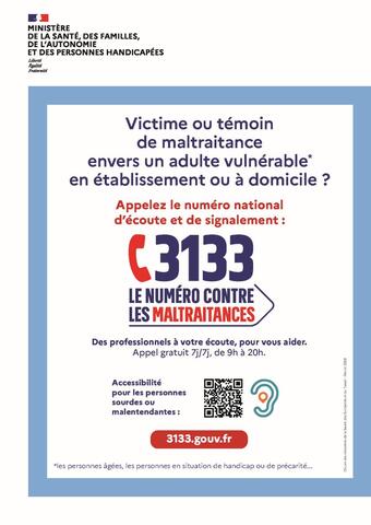 Depuis le 1er mars 2026, le 3133 est le numéro national dédié à la lutte contre les maltraitances envers les adultes vulnérables. Gratuit et accessible 7 jours sur 7, de 9 h à 20 h, il remplace le 3977 et s’adresse à toute personne victime ou témoin de maltraitance envers :