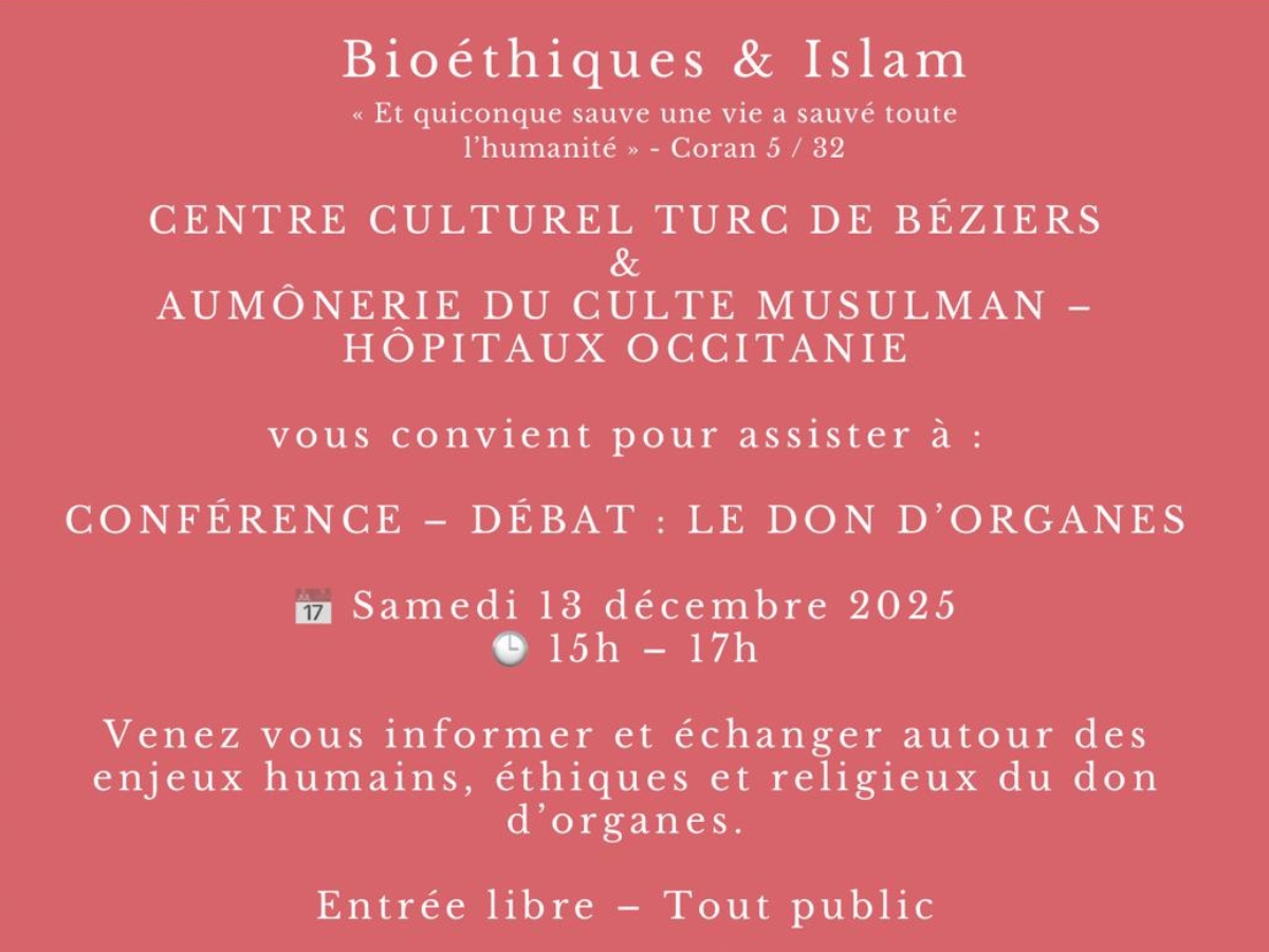 Dans le cadre de sa mission d’accompagnement spirituel et éthique des patients et de leurs familles, l’Aumônerie du Culte Musulman des Hôpitaux de l’Occitanie organise une conférence - débat sur le don d’organes.