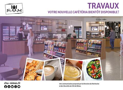 La cafétéria du CHU de Nîmes change de prestataire et entre dans une phase de transformation pour vous proposer, très prochainement, un espace repensé, agrandi et doté d’une offre alimentaire de qualité, privilégiant les circuits courts.