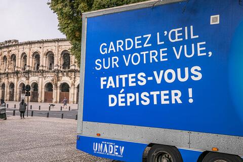 Le Bus de l’Union Nationale des Aveugles et Déficients Visuels (UNADEV) s'est installé pendant plusieurs jours sur l’Esplanade Charles de Gaulle à Nîmes. Dans ce camion, transformé en véritable cabinet ophtalmologique mobile, permet au grand public de bénéficier d’un dépistage gratuit des principales maladies cécitantes liées à l’âge : glaucome, DMLA, cataracte et rétinopathie diabétique.