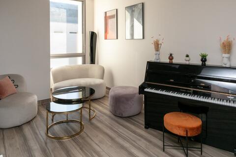 Pensé comme un véritable cocon, le salon a été aménagé entièrement : des fauteuils confortables, un coin lecture, des jeux et du coloriage pour les enfants, et même un piano. Trois œuvres de l’artiste Nicole Bousquet, représentant des figures féminines fortes comme Frida Kahlo ou Lee Miller, habillent les murs de couleurs et de caractère. L’ensemble a été imaginé par le studio K-Home Design, qui a su insuffler à la pièce une atmosphère paisible et conviviale.