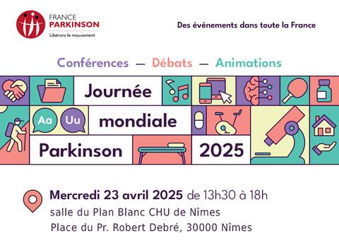 À l'occasion de la Journée mondiale de la maladie de Parkinson, le Comité Gard de l'association France Parkinson organise un événement le mercredi 23 avril 2025, de 13h30 à 18h, à la salle du Plan Blanc du CHU de Nîmes, située Place du Pr. Robert Debré à Nîmes.