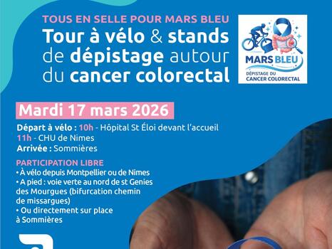 Randonnée à vélo depuis le CHU de Nîmes et le CHU de Montpellier vers Sommières. A l’arrivée, un stand de dépistage pour promouvoir le dépistage du cancer colorectal en renforçant la cohérence et la visibilité des messages de prévention sur le territoire.