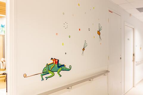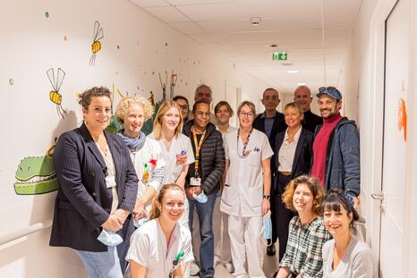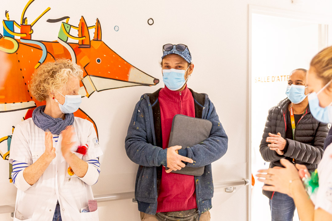 Les enfants ont participé en partageant dessins et idées, dont plusieurs ont été intégrés directement à la fresque. Les soignants ont également contribué, permettant de créer une œuvre collective, adaptée au quotidien du service. Ce travail à plusieurs voix a permis de concevoir un espace accueillant, vivant et unique, où chacun se reconnaît.