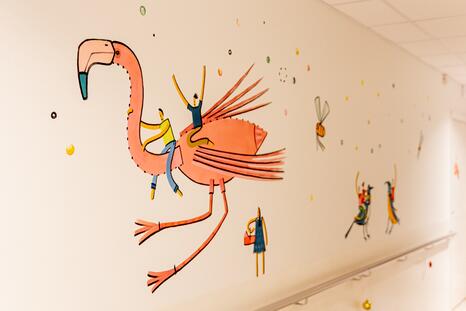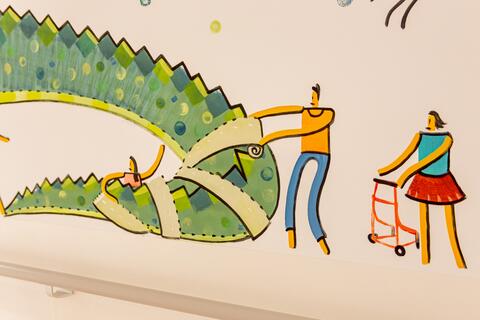 Pour le MPR pédiatrique, ADEC a imaginé une fresque légère et onirique en intégrant les idées des enfants et des soignants : un crocodile en équilibre, un cochon volant grâce à des abeilles, des silhouettes d'humains flottant dans un univers coloré… Autant d’éléments pensés pour stimuler l’imaginaire, rassurer les jeunes patients et créer un lien ludique avec le personnel soignant.
